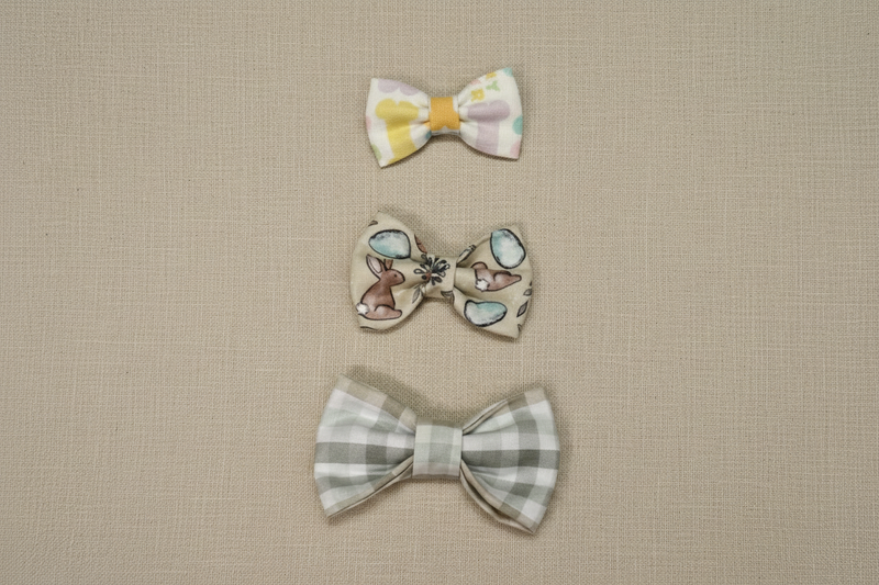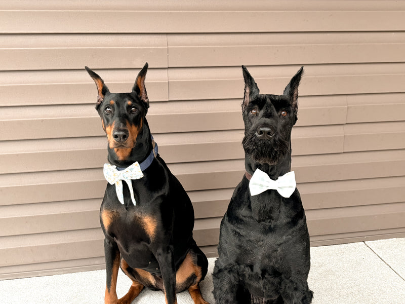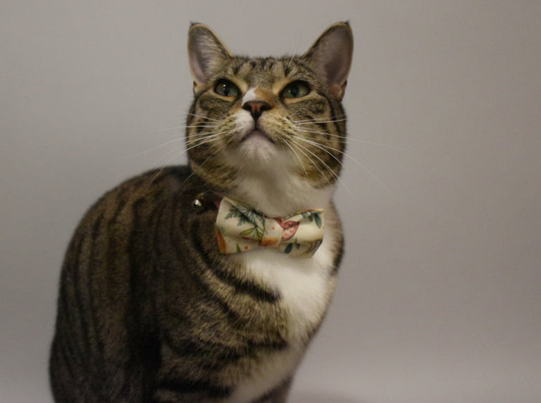 Olive modeling our size small bow tie. Recommended for cats and small dogs.